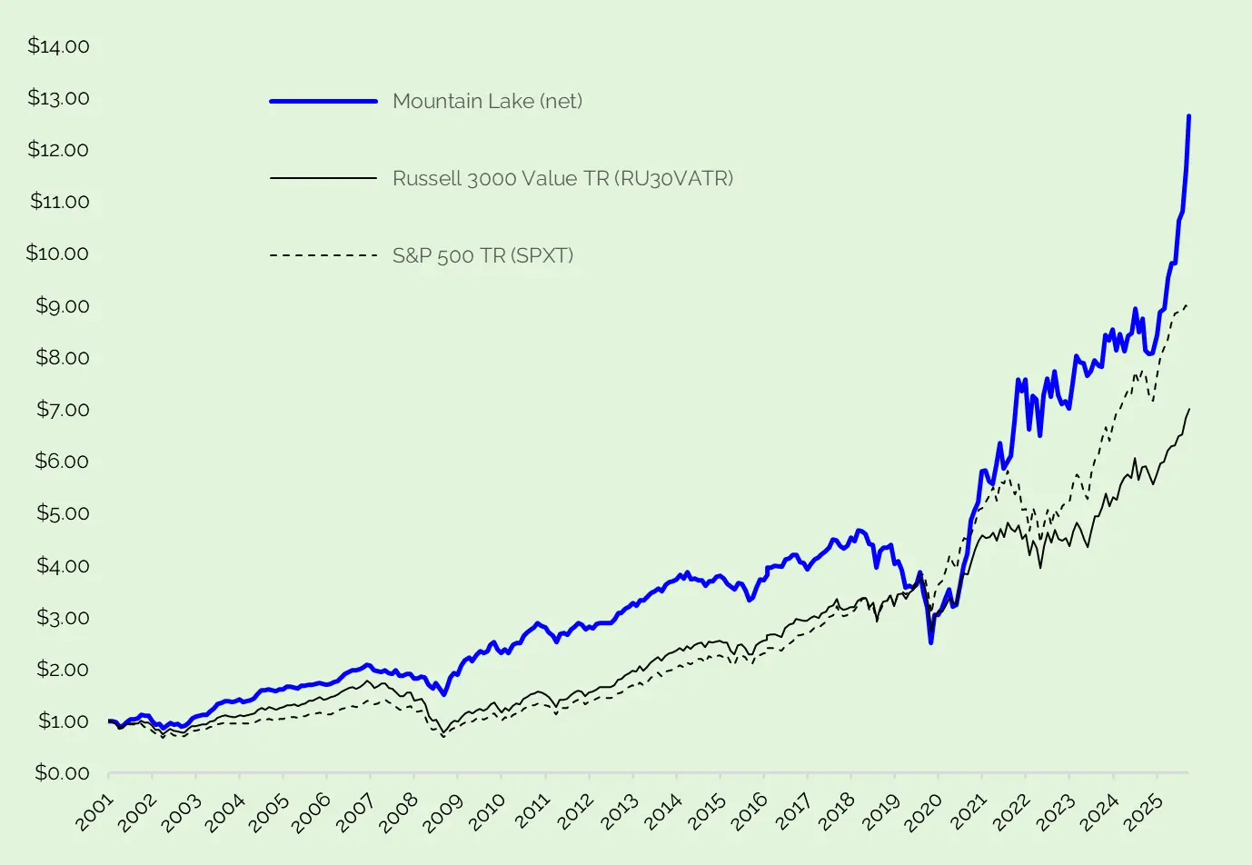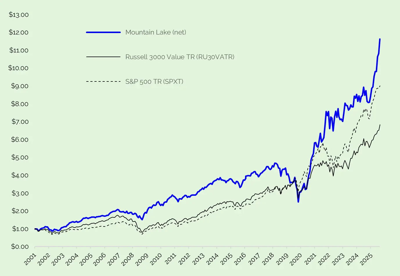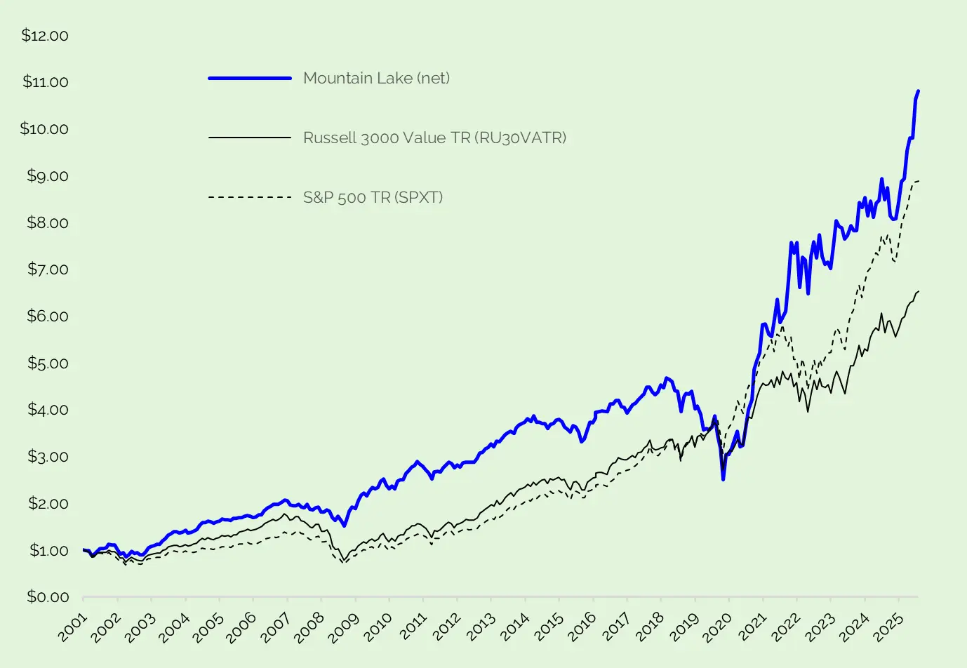 We have cumulatively outperformed the Russell 3000 Value and S&P 500, net of fees, since our inception in 2001.